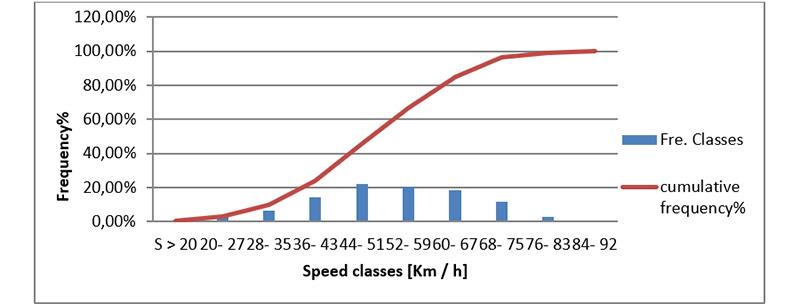 Fig. 7 - Histogram and cumulative distribution of observed vehicle speeds (speed limited to 50 and 60 km/h).